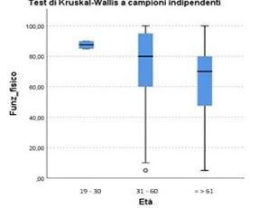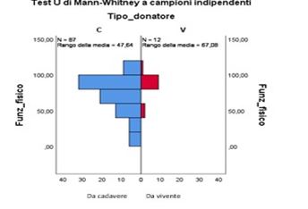 I domini della SF-36 presentano, ai test non parametrici, una distribuzione omogenea nelle variabili demografiche e socio-sanitarie, tranne che nella dimensione “Funzionamento fisico”, in cui le frequenze si distribuiscono in modo disomogeneo entro le fasce di età e tra i due tipi di donatore (Tabella. 1): la distribuzione per età è sbilanciata verso i valori più bassi, nella fascia > 65aa (Figura. 3); quella per tipo di donatore si allunga verso il basso, tra i riceventi da cadavere (Figura. 4).