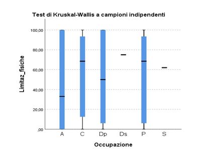 La distribuzione delle frequenze della dimensione Limitazioni fisiche di ruolo tra le occupazioni dei rispondenti, seppur priva di significatività statistica, rivela il maggior carico tra le casalinghe (C) e i pensionati (P) (Figura. 5).