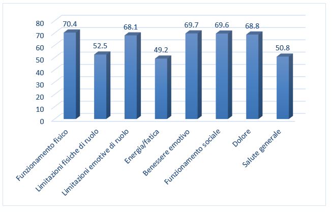 Rispetto ai PDTA, 92 persone dichiarano di esserne informate. La qualità dell’assistenza è apprezzata dal campione: 64 persone definiscono la professionalità degli operatori come ottima e 34 come molta; 65 persone soppesano la cortesia degli operatori come totale e 31 come abbastanza. Nei domini della SF-36, i punteggi riportati dal campione ne tratteggiano un profilo intorno al punteggio di 70, tranne che nelle variabili Limitazioni fisiche di ruolo (RF), Energia/fatica (VT) e Salute generale (SG), nelle quali in punteggio si posiziona attorno a 50 (Figura 2).