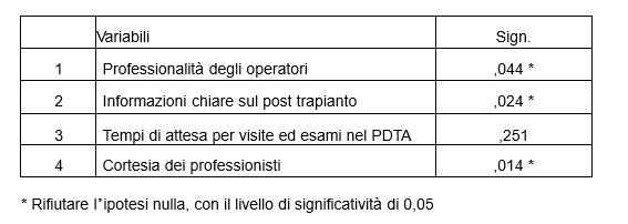 Il proposito (certo – dubbio – negativo) di consigliare ad altri i PDTA attivati, associato nel Test di Kruskal-Wallis con le variabili di qualità assistenziale percepita, presenta distribuzioni significativamente differenti entro tutti gli indicatori (professionalità, cortesia degli operatori e chiarezza delle informazioni ricevute sul post trapianto), tranne che nei tempi di attesa per l’effettuazione di visite ed esami protocollari (Tabella 2).